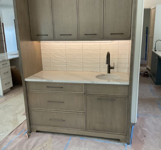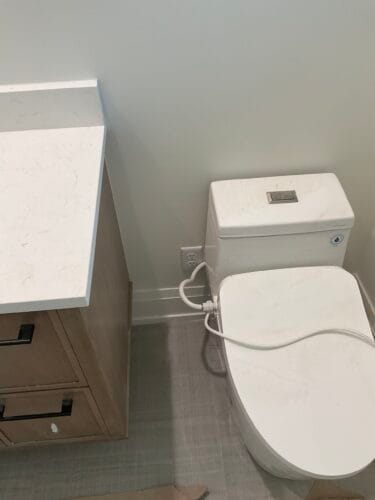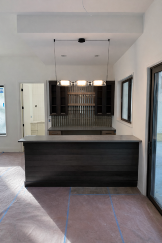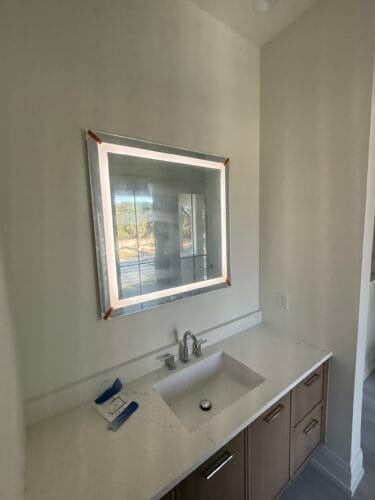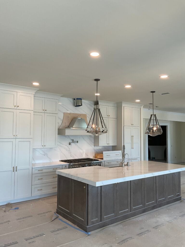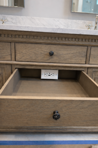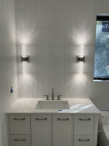 After cabinets, tile, and finishes, we install outlets, switches, lighting, and devices.